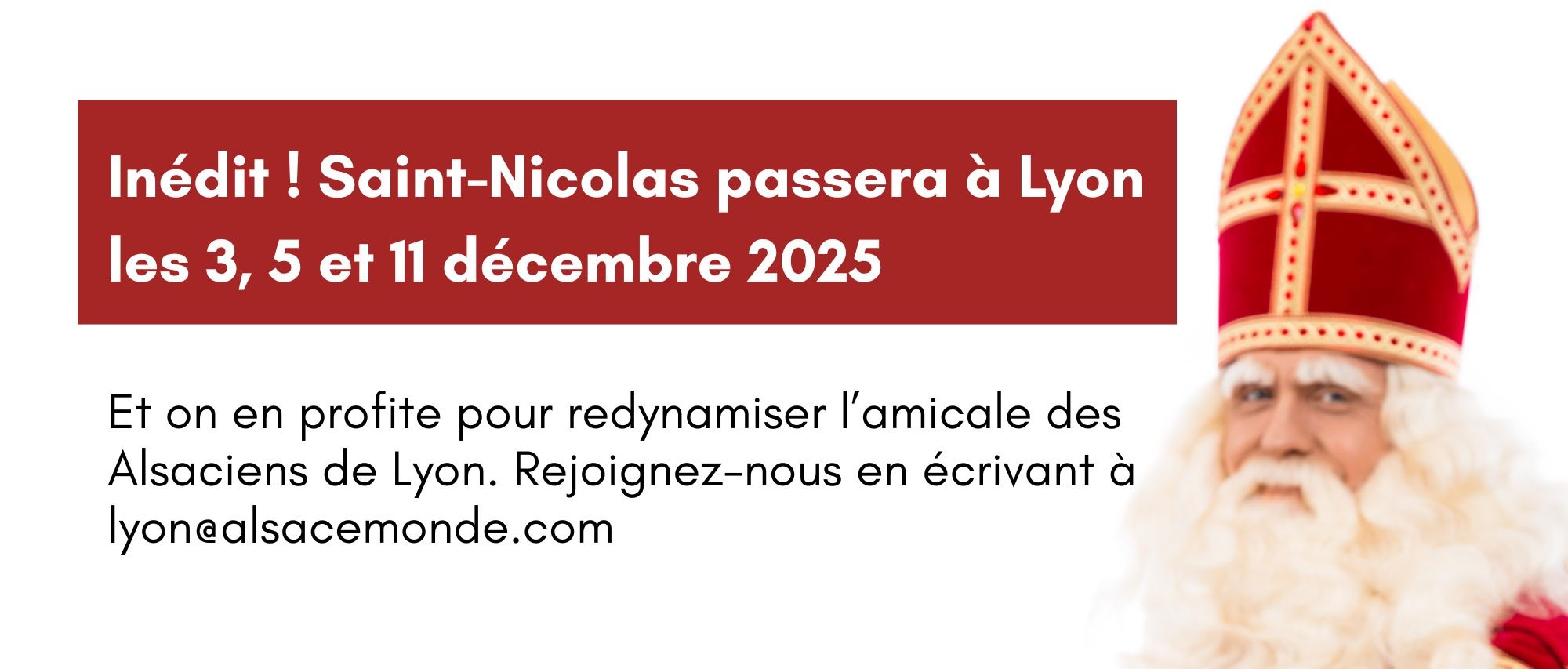 Et comme le winstub est déjà complet le 3 décembre, et qu'il faut éviter la "Fête des Lumières" (Lyon attend 2 millions de visiteurs du 5 au 8 décembre), un deuxième Stammtisch de Saint-Nicolas sera organisé le mercredi 10 décembre 2025 à 19h au restaurant L'Alsacien (réservations en direct en appelant Olivier Metz, patron du restaurant et associé de la Franchise L'Alsacien, au 06.37.49.16.68).