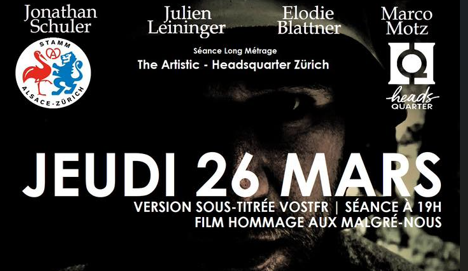 L’association Stamm Alsace-Zurich propose une projection du film en hommage aux Malgré-Nous en partenariat avec l’Alliance française, le jeudi 26 mars à 19h, au sein de l’Espace Culturel The Artistic à Zurich.